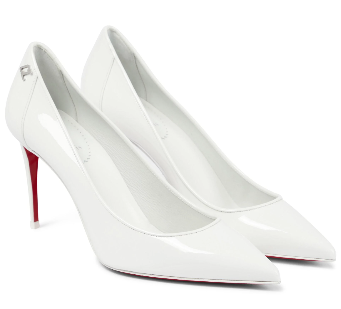 Christian Louboutin scarpe décolleté in pelle di vitello verniciata bianco con punta affusolata, iniziali logo metalliche LC sul lato esterno della scarpa, suola in pelle verniciata rossa e tacco a spillo. Tacco: 8,5 cm