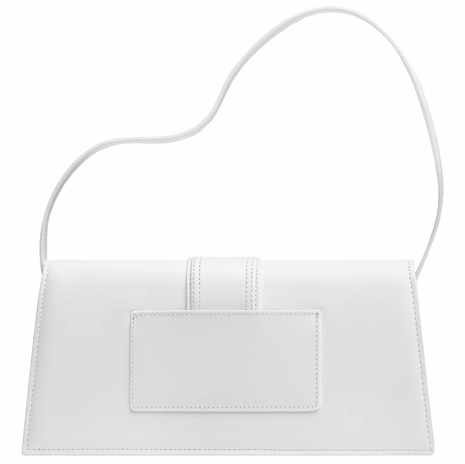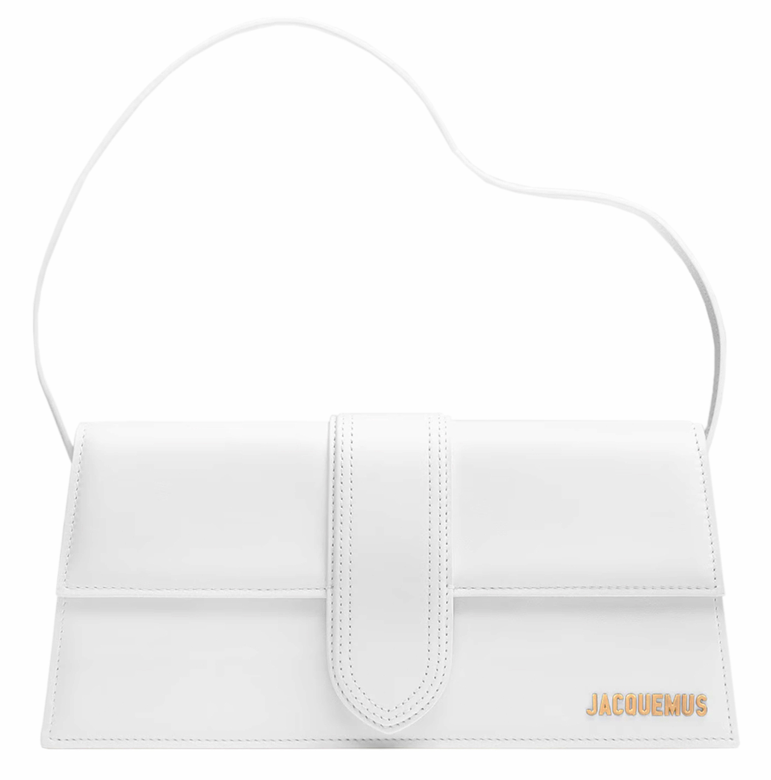 Jacquemus Le Grand Bambino long borsa a spalla strutturata in pelle liscia. Chiusura magnetica con patta frontale, tasca piatta interna e tasca aperta sul retro. Finiture metalliche color oro con logo Jacquemus inciso, impunture a vista e bordi tinti. Interno foderato in cotone, completa di dustbag.