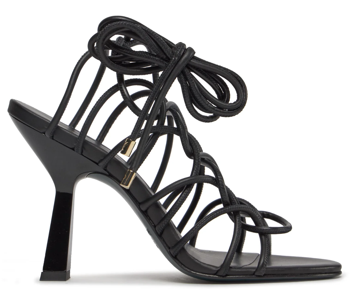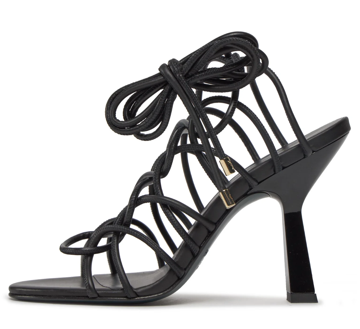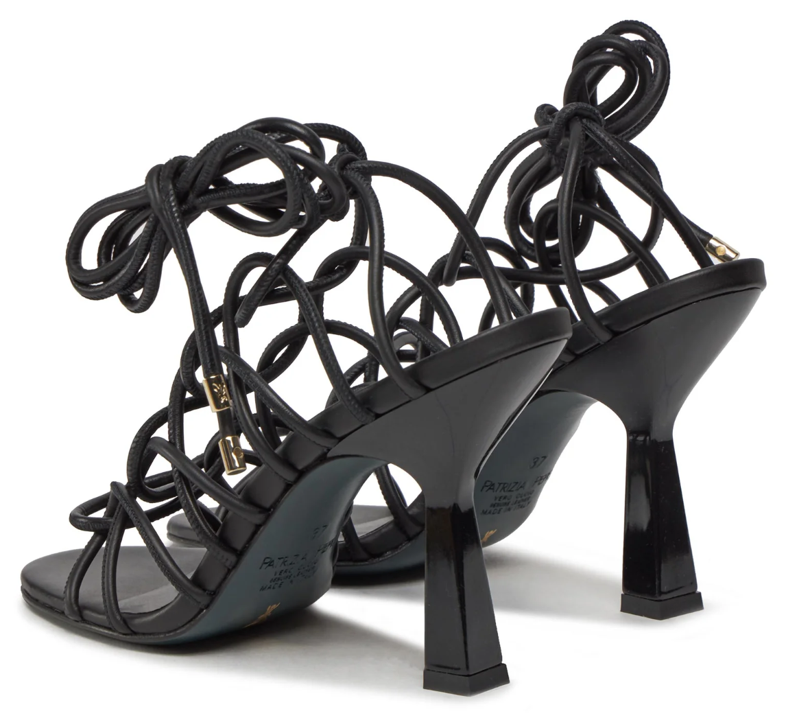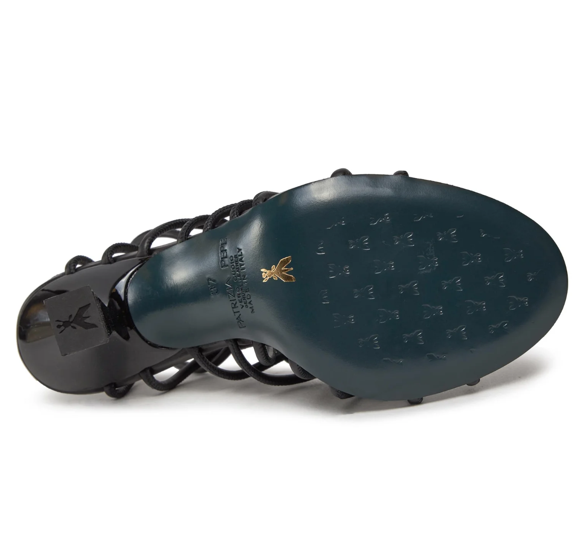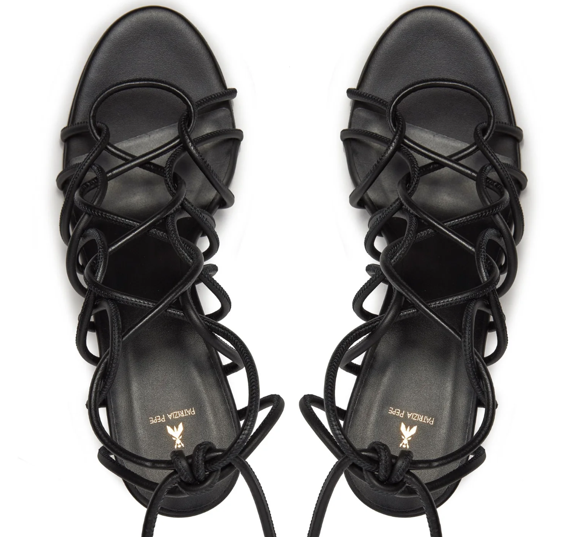 Patrizia Pepe sandali in pelle di vitello nera con tomaia formata da una stringa di pelle intrecciata e annodata, tacco in plastica lucida, suola in pelle.